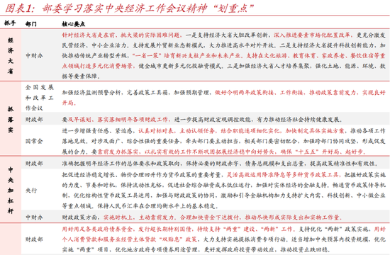 中央经济工作会议作为定调次年大基调和总体部署的会议,各部委各地传达学习会议精神属于惯例,也是跟踪会议精神落地的重要窗口。总体上,各部委各地均从“稳中求进、提质增效”、宏观政策“更加积极有为”入手,各部委结合自身职能定位明确后续落实举措,各地因地制宜“划重点”,短期均强调推动政策“靠前发力”、确保年初开门红。