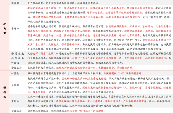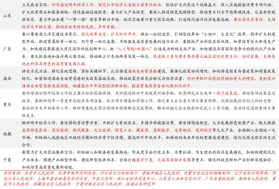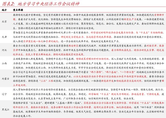 1、总体看,各方均围绕中央经济工作会议“稳中求进、提质增效”大基调细化部署,方向明确、重点突出,扩内需、强科技、促改革、扩开放、稳地产等更为细化,多强调政策要“靠前发力”、实现良好开局。