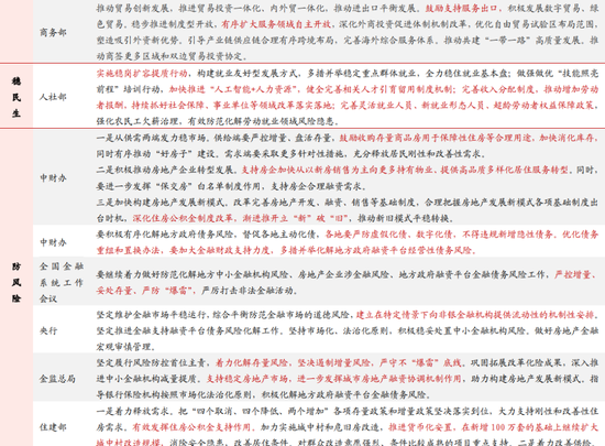 总体看,全国金融系统工作会议、央行、金监总局等定调一致,针对各类风险要“着力化解存量风险,坚决遏制增量风险,严守不‘爆雷’底线”,其中:1)稳地产方面,住建部部署仍然是着力释放需求、改善供给,中财办部署兼顾居民、房企,包括供给端加快消化库存、需求端要采取更多针对性措施、支持房企转型发展、深化住房公积金制度改革等;2)化债方面,重申不得违规新增隐性债务,但也提到要加大金融财政支持力度、多措并举化解地方政府融资平台经营性债务风险。
