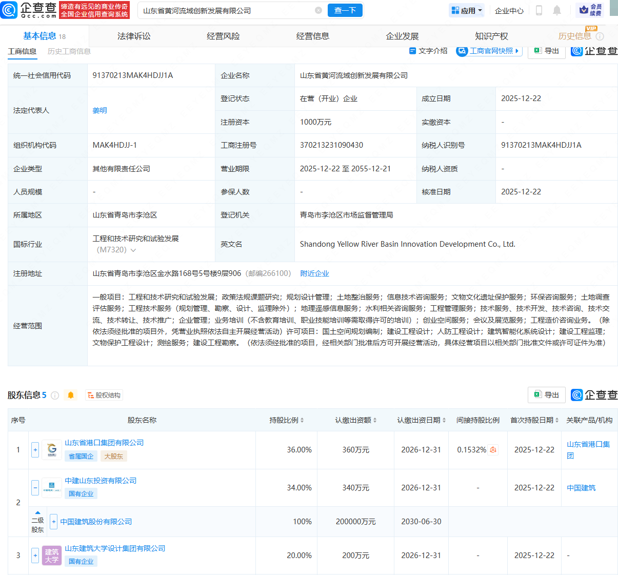 近日,山东省黄河流域创新发展有限公司成立,法定代表人为姜明,注册资本为1000万元,经营范围包含:土地整治服务;信息技术咨询服务;文物文化遗址保护服务;环保咨询服务;土地调查评估服务等。企查查股权穿透显示,该公司由山东省港口集团有限公司、中国建筑(601668)全资子公司中建山东投资有限公司等共同持股。